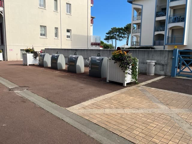 The bins are located outside on the unloading street, opposite the parking lot.